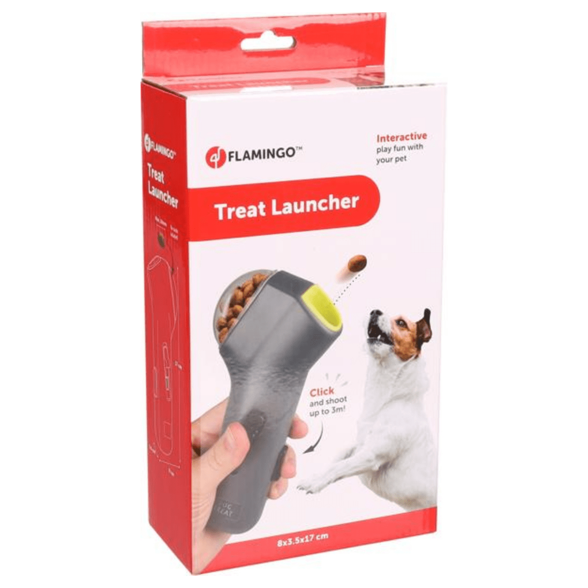 • Schießt Snacks bis zu 3 Meter weit